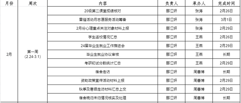 理学院学工2023/2024学年第二学期第一周工作安排(2月26日-3月3日)