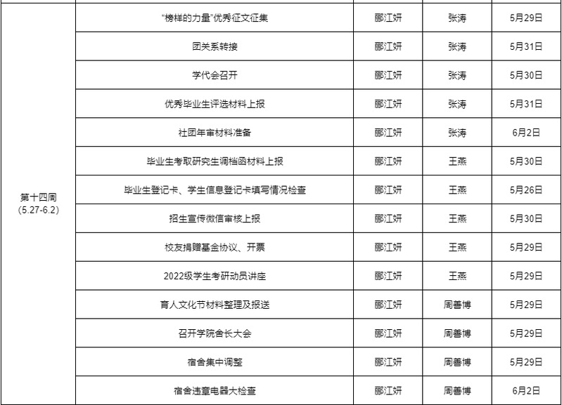 理学院学工2023/2024学年第二学期第十四周工作安排