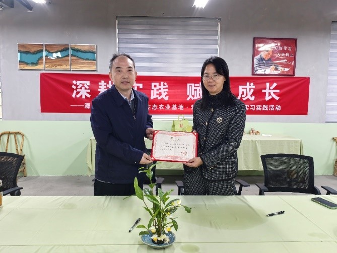 活动现场,陈荣军介绍了理学院在应用型人才培养、学科交叉实践教学方面的探索;两位专家详细介绍了基地在生态农业技术创新、产业数字化转型中的布局,以及对数学统计类专业人才的实践需求。校企双方举行产业教授聘任仪式,进一步深化人才培养与产业发展的联动合作。基地的生态农业场景为师生提供了“沉浸式”实践课堂,师生团队深入生态农业基地,围绕农业生产数据统计、生态模型构建等方向,将数学、统计专业知识与农业产业实际需求深度结合,开展实践探索。